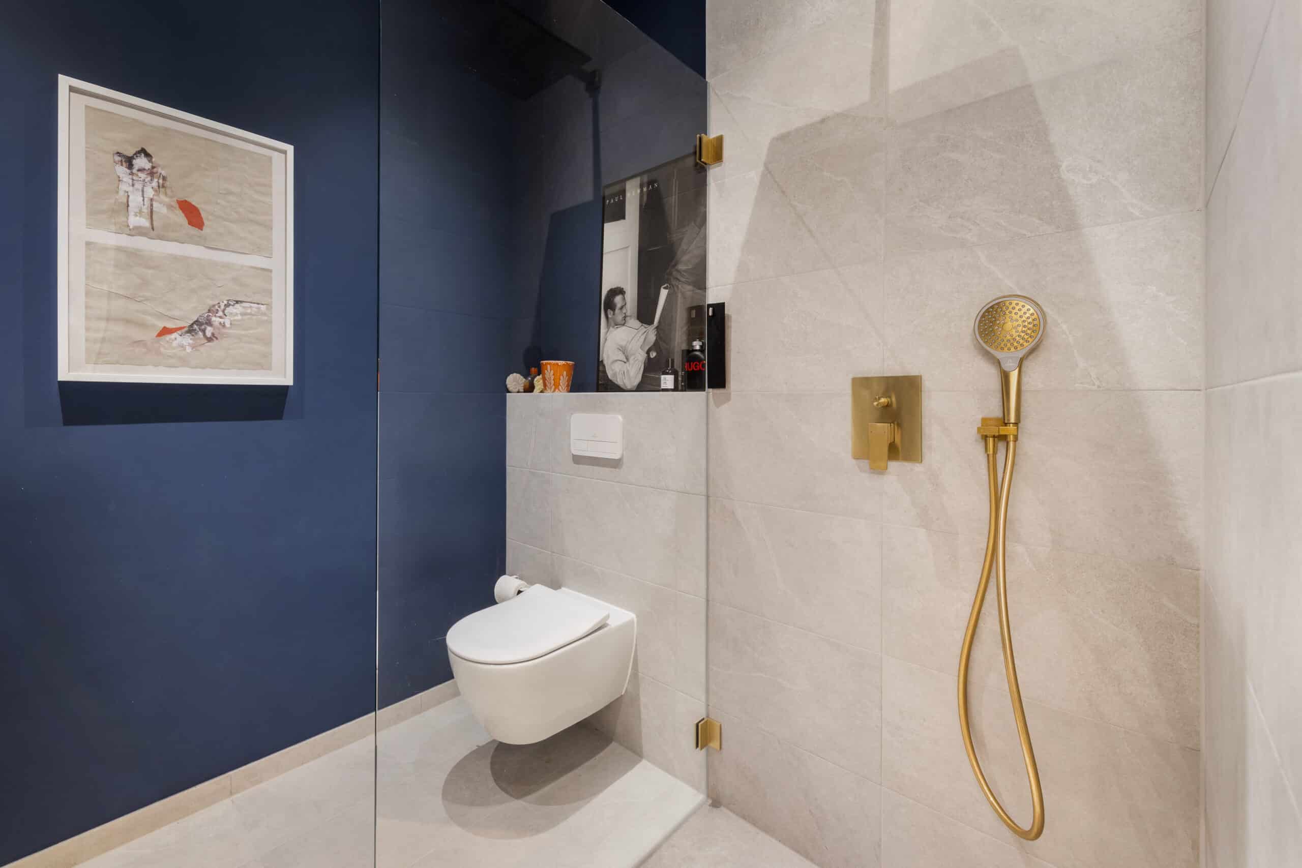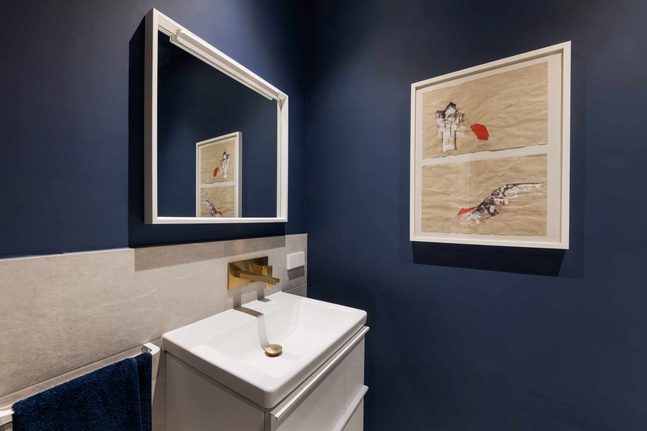 - Im Bad trifft man auf ein mutiges, aber modernes Farbkonzept: tiefes Nachtblau kombiniert mit warmen Grautönen.