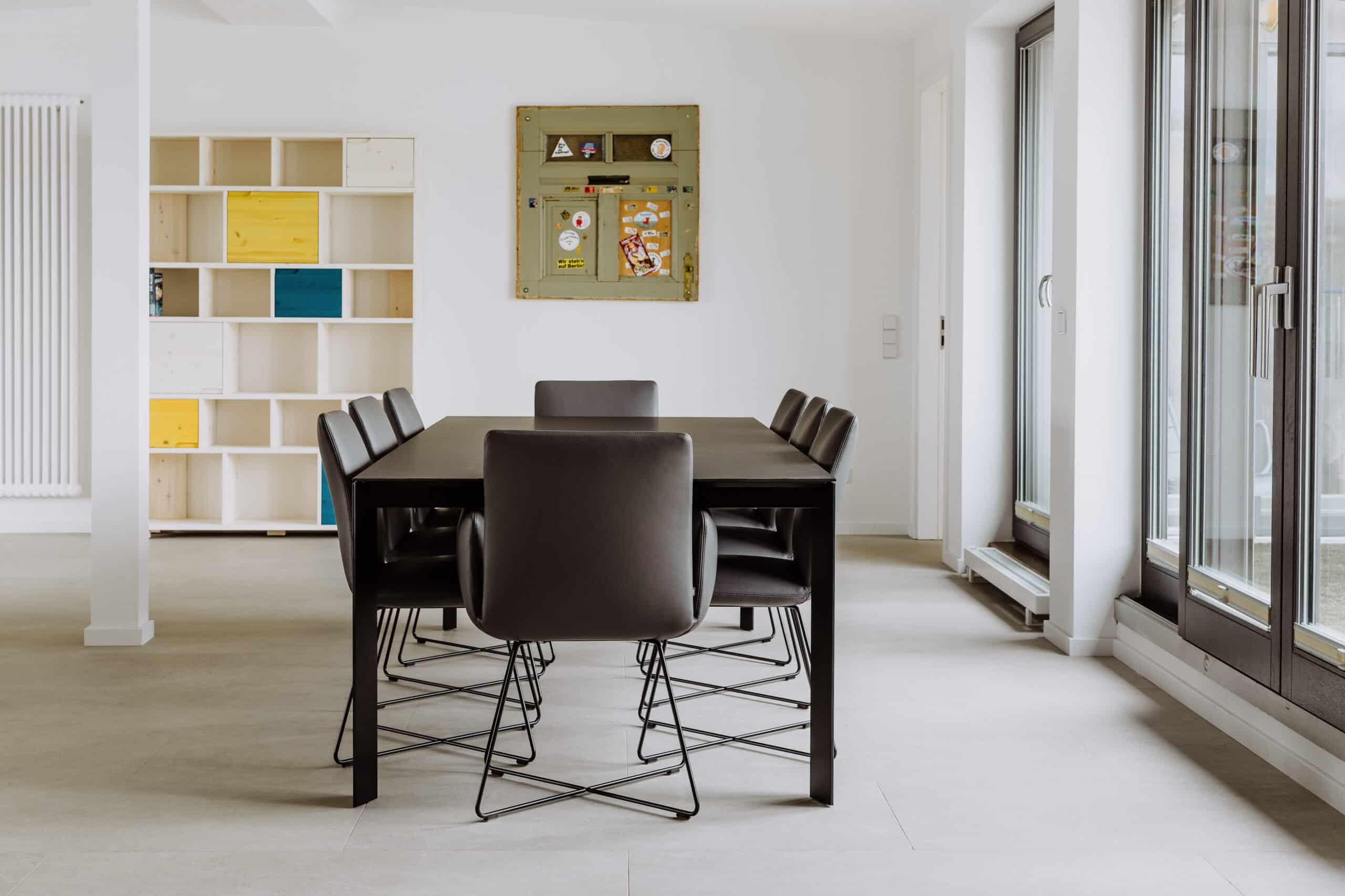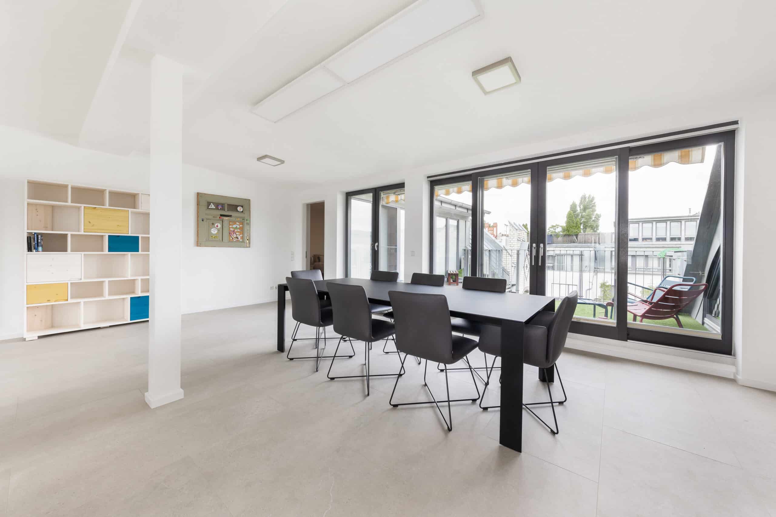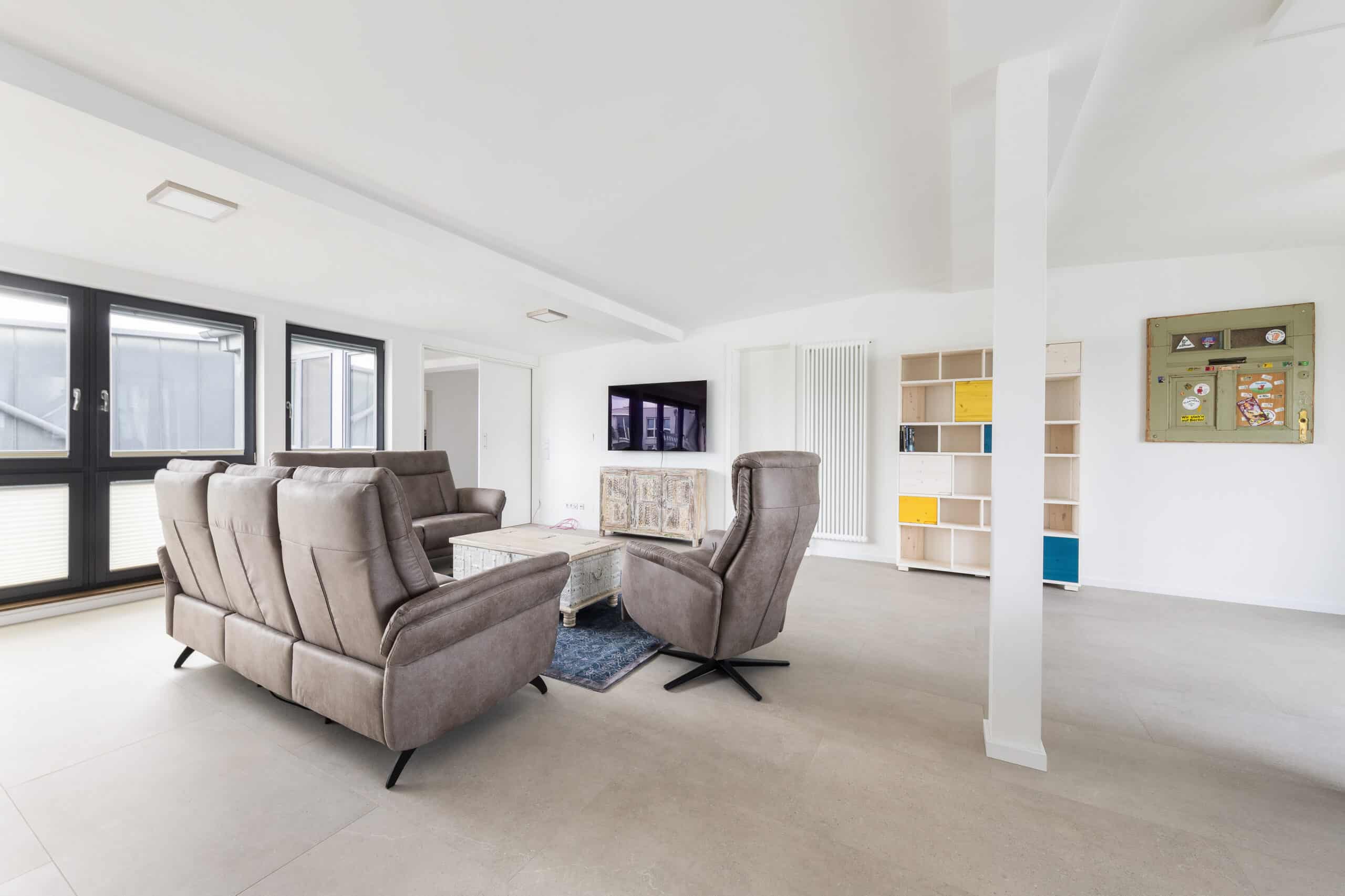 - Das Gesamtbild wird durch elegante, weiße Sockelleisten harmonisch abgerundet, die den modernen und dennoch klassischen Charakter der Wohnung unterstreichen