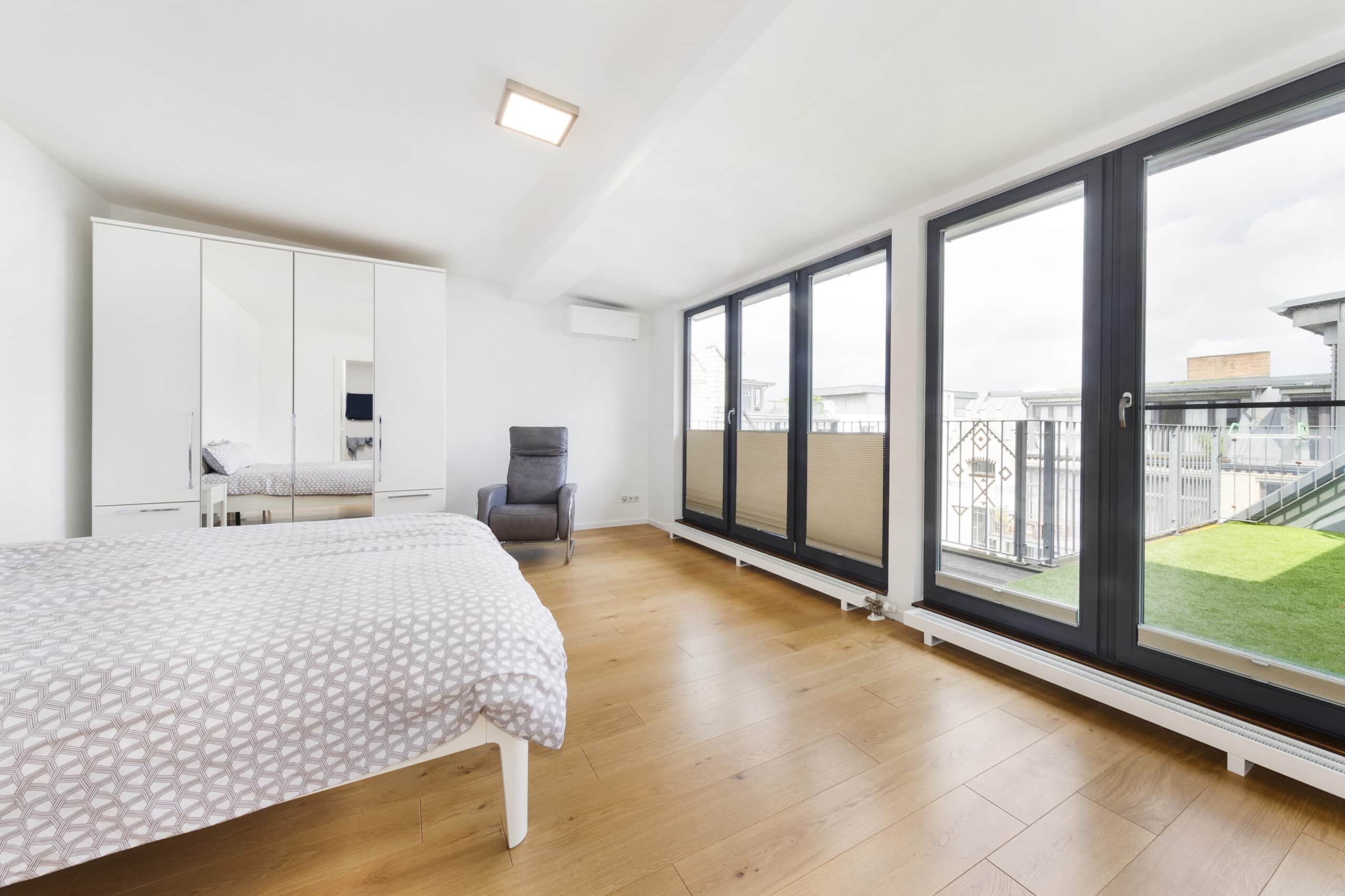 - Der Schlafbereich begeistert mit einem edlen Parkett aus naturbelassener Eiche, das Wärme und Natürlichkeit ausstrahlt.